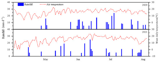 The experiments were conducted in Inner Mongolia (41°30′ N, 111°64′ E) in China in 2020 and 2021. The detailed physical and chemical properties of the field soils at the 0–20 cm depth are reported in Table 3. Soil texture was sandy loam. Precipitation and mean daily air temperatures in experimental years are shown in Figure 4. The precipitation during potato growth was 185.9 mm in 2020, and 137.3 mm in 2021. The previous crops were wheat in the two years.
