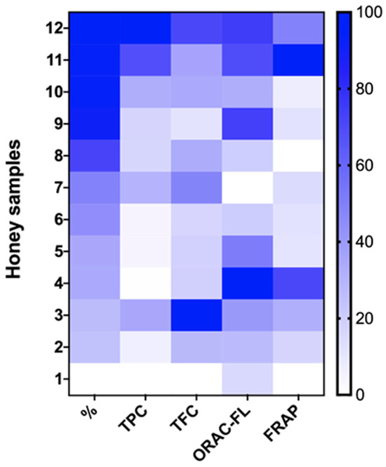 Heat map analysis for parameters studied in all honey samples (%: percentage of quillay pollen; TPC: total phenolic content; TFC: total flavonoid content; ORAC-FL: oxygen radical absorbance capacity; FRAP: ferric reducing antioxidant power).