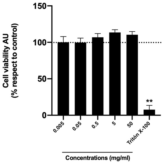 Honey samples’ cytotoxicity. Cell viability was evaluated by Alamar blue of HuH-7 cells treated for 24 h with honey extract of the test sample (sample 9) at different dilutions (0.005, 0.05, 0.5, 5, and 50 mg/mL). To control cell death, cells were treated with Triton X-100 at 1% for 10 min. Data are expressed as the percentage of viability with respect to the control cells. AU, arbitrary units. Data are shown as mean ± SD (n = 3). A one-way ANOVA statistical test was performed, followed by the Tukey test. Statistically significant differences compared to the control group (cells without treatment) (** p < 0.01).