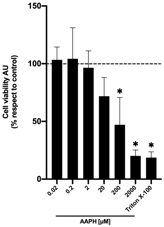 AAPH-induced cell death. Cell viability was evaluated by Alamar blue of HuH-7 cells treated with 2,2′-Azobis (2-amidinopropane) dihydrochloride (AAPH) for 24 h at different concentrations (0.02–2000 μM). For cell death control, cells were treated with Triton X-100 at 1% for 10 min. Data are expressed as a percentage of viability with respect to the control cells. Data are shown as mean ± SD (n = 3). AU, arbitrary units. A one-way ANOVA statistical test was performed, followed by the Tukey test. Statistically significant differences compared to the control group (cells without treatment) (* p < 0.05).