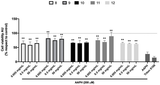 Honey extracts prevent AAPH-induced cell death. Cell viability was evaluated by Alamar blue of HuH-7 cells treated with quillay honey extracts (samples 8, 9, 10, 11, and 12) at different dilutions (0.005, 0.5, and 50 mg/mL at the final concentration in the medium) and co-treatment with 2,2′-Azobis (2-amidinopropane) dihydrochloride (AAPH) for 24 h at 200 μM. To control cell death, cells were treated with Triton X100 at 1% for 10 min. Data are expressed as a percentage of viability compared to the control group (untreated cells). AU, arbitrary units. Data are shown as mean ± SD (n = 3–5). A one-way ANOVA statistical test was performed, followed by the Tukey post hoc test. Statistically significant differences compared to the cells treated only with AAPH (** p < 0.01).
