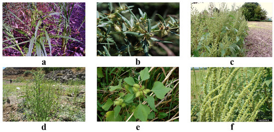 Dataset samples. (a) Amaranthus retroflexus, (b) Xanthium spinosum, (c) Xanthium sibiricum, (d) Amaranthus palmeri, (e) Xanthium italicum, (f) Amaranthus hybridus.