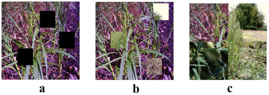 where w and h are the width and height of the target image, and is the image part taken from the i-th image used in the stitching. The application of these image augmentation techniques significantly enhanced the complexity and diversity of the dataset, laying a solid foundation for training a robust weed detection model. These techniques not only simulated the various visual challenges encountered in agricultural scenarios, such as partial occlusions and mixing of different vegetation types, but also enhanced the model’s adaptability and recognition capabilities in these complex situations.