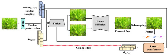 The weed detection method proposed in this study adopts a multimodule DL framework, with the overall process designed to enhance the processing and recognition capabilities of complex agricultural images through the integration of a latent diffusion transformer. This method is primarily divided into three core modules: the latent-based diffusion subnetwork, the latent-based transformer subnetwork, and the latent loss function, as shown in Figure 3. Each module plays a specific role in the overall workflow, achieving gradual optimization of data and feature extraction through efficient connections.