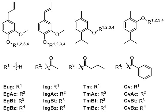 All esters were synthesized using classical methodologies and obtained in yields that varied from good, in the case of the esters Eugenyl acetate (EgAc), Isoeugenyl acetate (IegAc), Thymol acetate (TmAc), Thymol butyrate (TmBt), Carvacryl acetate (CvAc) and Carvacryl butyrate (CvBt) to reasonable, in the case of the esters Eugenyl butyrate (EgBt), Eugenyl benzoate (EgBz), Isoeugenyl butyrate (IegBt), Isoeugenyl benzoate (IegBz), Thymol benzoate (TmBz), and Carvacryl benzoate (CvBz). After purification, the target substances were obtained with a high level of purity.