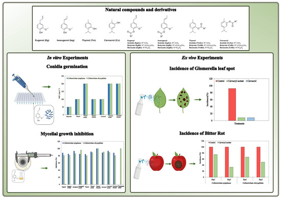 A large selection of essential oils from medicinal plants and their majority compounds was previously published by Rozwalka et al. 2020 [36] showing effect to control disease of grapes. Therefore, this study aimed to assess the antifungal activity of eugenol, isoeugenol, thymol, carvacrol, and some of their ester derivatives in search of alternatives to inhibit Colletotrichum nymphaeae and Colletotrichum chrysophillum and to control GLS and BR, caused by two prevalent species in the main production apple areas of Brazil.
