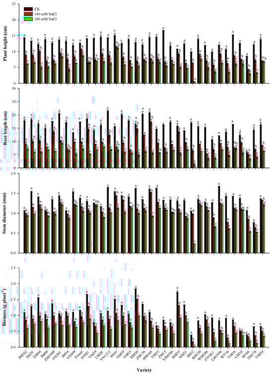 Changes in the main morphological traits of 35 wheat varieties at the seedling stage under control conditions (CK), 140 mM NaCl, and 180 mM NaCl. Data are expressed as the mean ± standard error (n = 6). Different letters above the bars indicate the least significance at the p < 0.05 level within each wheat variety.