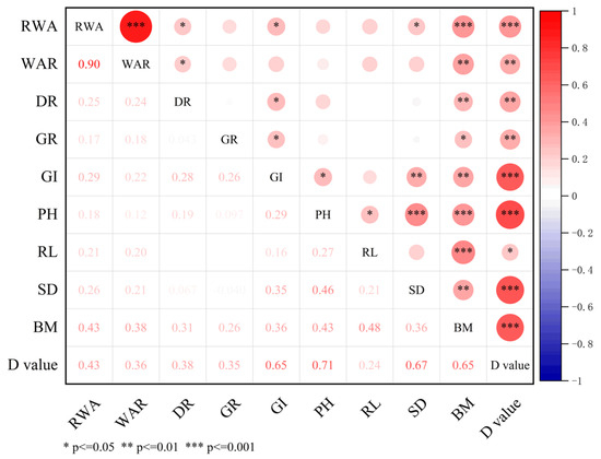 Correlation between the salt tolerance index of various morphological indices and comprehensive salt tolerance indices (D2 value) at the germination and seedling stages of 35 wheat varieties. RWA, relative water absorption; WAR, seed water absorption rate; DR, seed dehiscence rate; GR, seed germination rate; GI, seed germination index; PH, plant height; RL, root length; SD, stem diameter; BM, biomass.