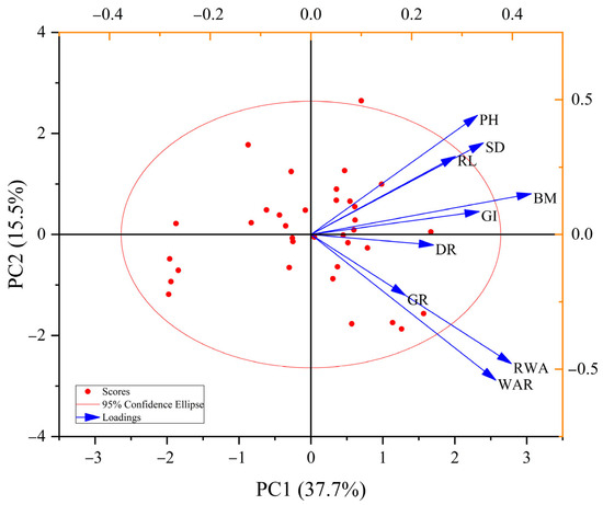 Principal component analysis of the salt tolerance index for each morphological parameter at the germination and seedling stages of 35 wheat varieties. RWA, relative water absorption; WAR, seed water absorption rate; DR, seed dehiscence rate; GR, seed germination rate; GI, seed germination index; PH, plant height; RL, root length; SD, stem diameter; BM, biomass.