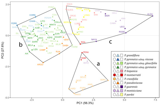 Geographic distribution of the Petrocoptis sampled populations. Symbol shapes indicate seed morphogroups (see Section 2 and Figure 1: circles, cluster a; triangles, cluster b; squares, cluster c) and colours depict prior identification following the taxonomic proposal by Montserrat & Fernández Casas [39]. Population codes follow Table S1.