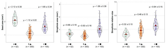 Comparison among the three k-means morphogroups (a, b and c), indicating the distribution, mean values and standard deviation of seed area (left), strophiole area (center) and strophiole relative size (right). Red dots indicate mean values and grey bars indicate median values. Every Games–Howell pairwise test showed significant differences.