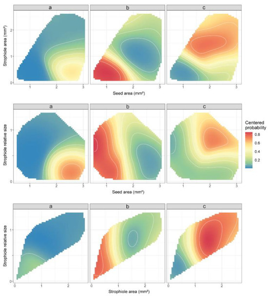 In line with previous ANOVA results, the variables with the highest classifying importance under the random forest model assumptions turned out to be the seed area, the strophiole area and the strophiole relative size. When combining these morphological traits, the support vector machine algorithm created a space of classification probabilities of a random seed in a given group (Figure 3). Thus, the highest probability of classifying a seed as part of cluster “a” (>0.6) was obtained when the seed area exceeded 2 mm2 and the strophiole relative size was below the threshold of 0.5. In the case of cluster “b”, any seed with a seed area of <1.75 mm2 and a strophiole area <1 mm2 was classified as such with a high probability (>0.8). Last, the highest values of classificatory probability within cluster “c” (>0.7) were obtained when the strophiole relative size exceeded the threshold of 1.