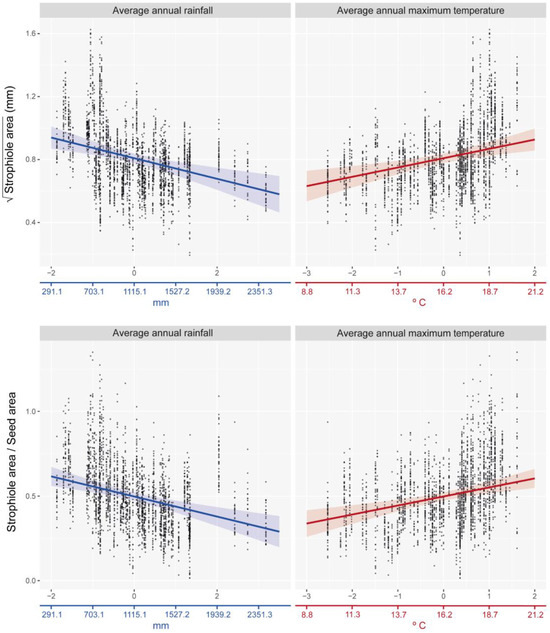 When implementing the grouping factor within the best climate models, it turned out to be the most fixed effect that collected the greatest amount of variance of both strophiole area (ΔAIC = 34.953, ΔRMSE = 0.110) and strophiole relative size (ΔAIC = 13.977, ΔRMSE = 0.042).
