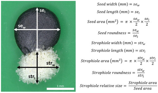 In total, 2773 seeds from 557 individuals were processed. Nine quantitative seed traits were selected following previous taxonomic accounts available for Petrocoptis [39] and other related taxa of the tribe Sileneae [108,109]. Seed digital images were captured with a Leica MC190 camera connected to an HD NIKON SMZ800 stereo microscope at 10× magnification with a resolution of 171 pixels mm−1. Then, images were semi-automatically processed with the software Leica Application Suite v4.12.0: seed and strophiole diameters were measured using software manual tools, and their respective area, roundness and strophiole relative size were automatically calculated (Figure 7).