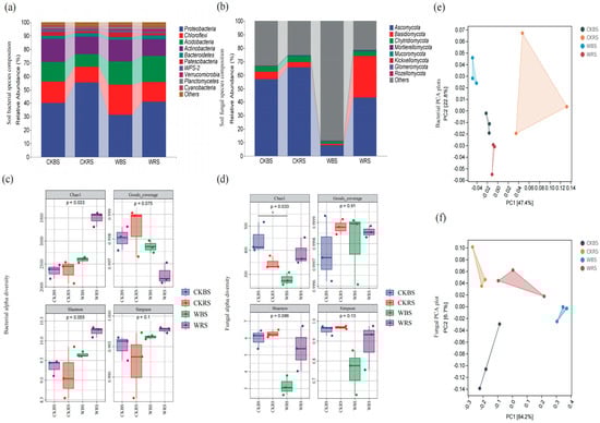 Changes in microbial diversity following treatment with phosphate-solubilizing bacteria in T. grandis. Panels (a,b) show the composition of bacterial and fungal communities, respectively, while (c,d) display the alpha diversity of these communities. Panels (e,f) present the principal component analysis (PCA) plots for bacteria and fungi, respectively. In Figures (a,b), the horizontal axis represents the four subgroups (CKBS, CKRS, WBS, WRS), and the vertical axis reflects the abundance of species at the genus level. The length of the bars corresponds to species abundance. The box plots in Figures (c,d) depict Chao1, which indicates total species richness, while the Simpson and Shannon indices measure microbial diversity within the soil samples. Good’s coverage reflects sample coverage. The p-value atop the box plot indicates the statistical significance of diversity index differences among the subgroups.