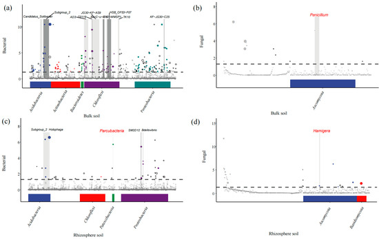 Species-level changes in soil microorganisms across different groups. (a) Bacterial changes in the bulk soil. (b) Fungal changes in the bulk soil. (c) Bacterial changes in the rhizosphere soil. (d) Fungal changes in the rhizosphere soil. The horizontal axis represents the ASVs, organized according to their taxonomic information from phylum to species, while the vertical axis reflects the −log10(adj-Pvalue) values. Each dot or circle represents an ASV, with its size indicating relative abundance, expressed in log2(CPM/n). The dotted line represents significance analysis. Microorganisms below the dotted line are not significant. The symbols above the dotted line are significant. A grayscale background highlights the top 10 genera with the most significantly upregulated points (default setting), and the genus name is labeled at the top of the figure.