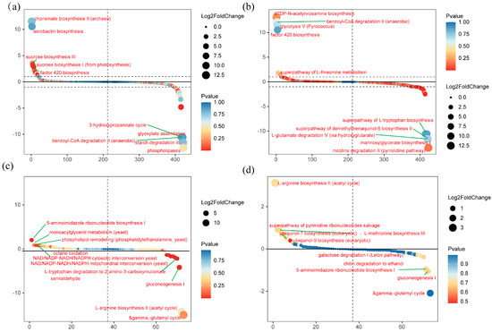 Microbial functional prediction analysis. Functional predictions for bacterial communities in bulk (a) and rhizosphere (b) soils, and fungal communities in bulk (c) and rhizosphere (d) soils. The vertical axis reflects the degree of upregulation (positive) or downregulation (negative) following inoculation. The colored dots indicate the significance of pathway changes (represented as the −log10 of the p-value), while the size of the dots corresponds to the extent of fold changes (represented as the log2 of the fold change).