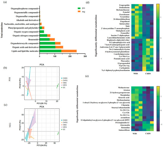 Analysis of significantly differential metabolites in soil. (a) Total metabolites identified across all soil samples. PCA of metabolites in positive-ion mode (POS) (b) and negative-ion mode (NEG). (c) The clustering of three samples in the same group indicates good reproducibility. A heatmap displaying significant differences in soil metabolites for POS (d) and NEG (e). The vertical axis lists the significantly different metabolites, while the horizontal axis shows the different groups. Yellow indicates elevated expression levels of significantly different metabolites, and blue indicates reduced expression levels. WBS and WRS represent treatment groups, while CKBS and CKRS serve as control groups.