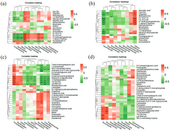 Correlation analysis of bacterial and fungal phyla with significantly differential metabolites.The asterisks (*, **, ***) represent the level of significance, where * indicates p ≤ 0.05, ** indicates p ≤ 0.01, and *** indicates p ≤ 0.001. (a) Correlation between bacterial phyla and significantly differential metabolites in bulk soil. (b) Correlation between fungal phyla and significantly differential metabolites in bulk soil. (c) Correlation between bacterial phyla and significantly differential metabolites in rhizosphere soil. (d) Correlation between fungal phyla and significantly differential metabolites in rhizosphere soil. Horizontal axis displays significantly differential metabolites (with some shown as abbreviations), while vertical axis represents microorganisms (ten most abundant phyla). Red indicates positive correlation, and green indicates negative correlation. 1,2-Dipalmitoyl-sn-glycero-3-phospho(1′-rac-glycerol) (DPPG).