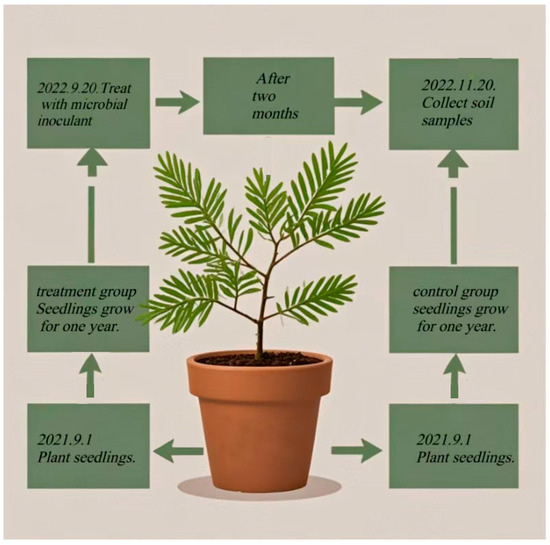 In the treatment group, the activated Burkholderia was inoculated into 50 mL of sterilized LB liquid medium, while the control group received 5 mL of sterile water in 50 mL of sterilized LB medium (Figure 7). Both groups were incubated at 28 °C with shaking at 220 r·min−1 for 5 days. The culture was then centrifuged at 12,000 r·min−1 for 10 min, and the bacterial pellet was resuspended in sterile water to achieve a concentration of 1 × 108 CFU·mL−1. The bacterial suspension was applied to the seedlings’ root zone through drip irrigation, with each pot receiving 10 mL of the suspension every 14 days. The control group received 10 mL of sterile water. Six replicates were used per treatment. After 60 days of cultivation in a constant-temperature chamber set at 26 °C, relative humidity 60–80%, soil samples were collected. The root systems of the T. grandis seedlings were gently removed, and the rhizosphere soil (RS) was collected by gently brushing off the soil attached to the roots. Bulk soil (BS) was gathered with a sterilized soil spoon, placed into sterile bags, and mixed thoroughly to form a composite sample. Each soil sample was divided into two portions: one was immediately preserved on dry ice to maintain microbial activity, while the other was stored at −80 °C for long-term preservation.