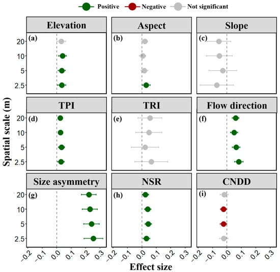 Parameter estimates of microtopographic (a–f) and neighborhood effects (g–i) on individual tree survival at neighborhood scales. Dots represent estimated parameter effects, with error bars indicating standard errors. A semi-transparent gray dashed line indicates a null effect (parameter estimate of zero) in each subplot.