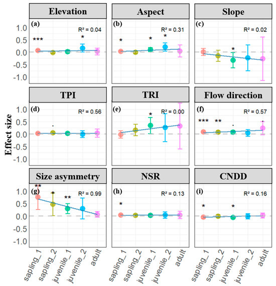 Parameter estimates of microtopographic (a–f) and neighborhood effects (g–i) on individual tree survival across different life history stage. Dots represent estimated coefficients with error bars depicting standard errors. Positive coefficients indicate positive effects, while negative coefficients indicate negative effects. Significance levels: • p < 0.1; * p < 0.05; ** p < 0.01; *** p < 0.001. In the inset figure, R-squared values represent the regression coefficient for changes across life stages, and light blue lines illustrate the trend of neighborhood effects across life stages.
