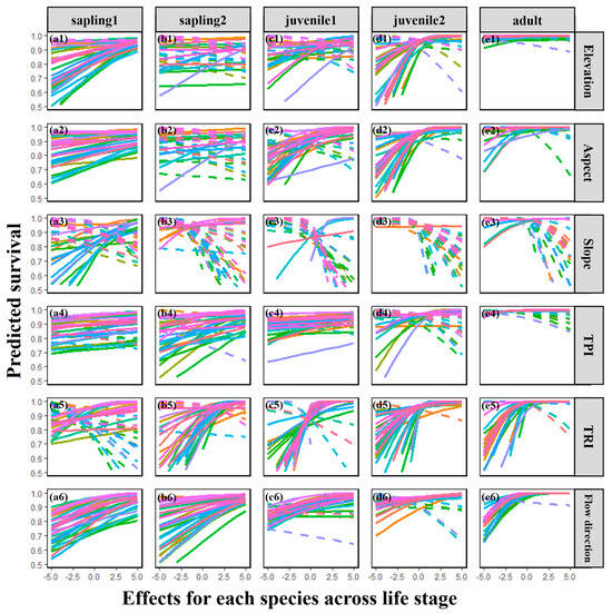 Relationship between six microtopographic factors (elevation: (a1–e1), aspect: (a2–e2), slope: (a3–e3), TPI: (a4–e4), TRI: (a5–e5) and flow direction: (a6–e6)) and survival probability among 32 species across life stages at a scale of 2.5 m. The figure displays predicted survival probability for each of the 32 observed species across life stages at a scale of 2.5 m, and other test scales are 5 m, 10 m, and 20 m; see Figure S3–S5 in the Supplementary Files. Different species are represented by different colors in the lines (see Figure S5 in the Supplementary Files): the solid line represents a positive effect and the dotted line represents a negative effect. Predicted survival probability is back-transformed from the generalized linear mixed model as described in the text, and all neighborhood effects were Z-score-transformed at quantification.