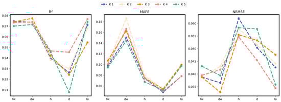 2, MAPE, and NRMSE indicators in fw, dw, h, d, and la growth traits, and each subgraph contains the results of the K-fold cross-validation method. Bold fonts in all tables represent the best results.