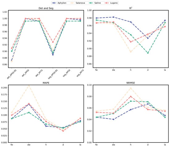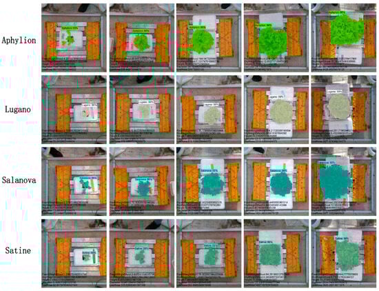 Figure 8. It can be seen from the figure that no matter the type of lettuce, the early segmentation effect is better, and different lettuce shows different forms as it grows. Both Lugano and Satine show leaf clumping and folding at the later stage of growth, but Satine has more prominent small leaf folds than Lugano, and the effect is relatively poor at the edges. The leaves of Salanova are more spread than other varieties, and careful observation shows that the effect is indeed the worst in the later stage. In Aphylion and Salanova, it can be observed that less of the edge is not covered, which means that the edge covers more of the non-leaf position, decreasing segmentation results, as evidenced by the indicators in the