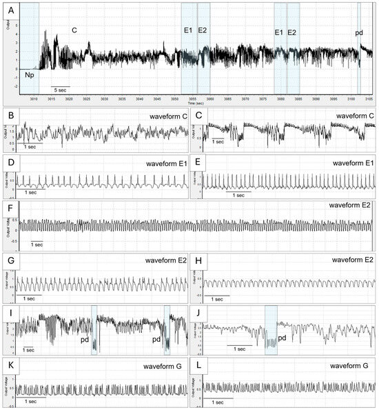 EPG waveforms of Bemisia tabaci whitefly were observed in the study. (A) The overview of EPG waveforms and details for 100 s with non-probing (Np), stylet pathway (C), phloem salivation (E1), phloem ingestion (E2), and potential drop (Pd) waveforms. Waveform C, (B,C). Waveform E1 (D,E). Waveform E2 (F–H). Waveform pd (I,J). Waveform G (K,L).