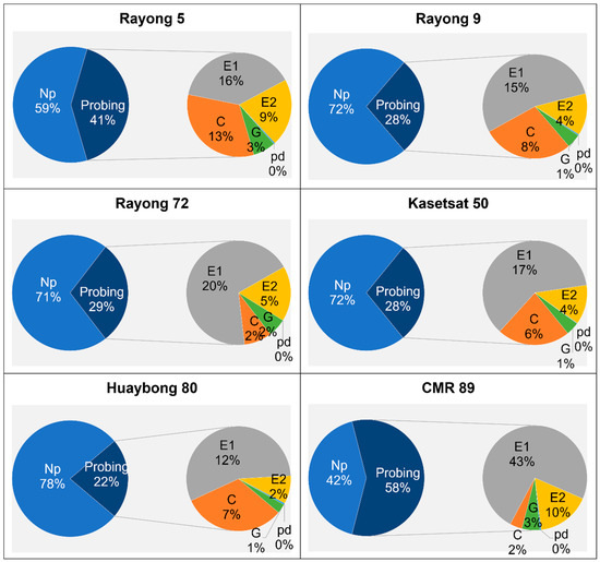 The TPD and TWD of adult whiteflies were calculated and compared between the six cassava cultivars (Figure 2). The data indicated that the adult whiteflies spent most of their time in the Np phase on the cassava leaf tissue, followed by the E1 waveform. Notably, the percentage of time spent in the Np phase was significantly longer on Huaybong 80, Kasetsart 50, Rayong 9, and Rayong 72 cultivars, averaging around 70%, compared to Rayong 5 and CMR 89 cultivars. The TPD for adult whiteflies revealed that the whiteflies spent more than 50% of the recording time on CMR 89 cultivars in probing. Additionally, CMR 89 showed higher total probe durations in the E1 and E2 waveforms (Figure 2).