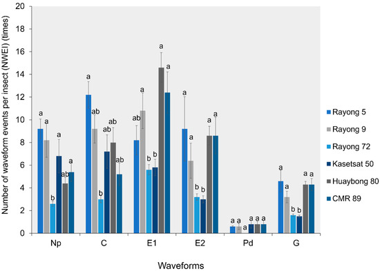 The number of waveform events per insect (NWEI) for all waveforms on six cassava cultivars. Bars (mean ± SE) with the same letter at the top within a waveform category are not significantly different at p = 0.05 (Tukey’s test): Np = non-probe; C = pathway phase; E1 = salivation phase; E2 = ingestion phase; Pd = potential drops; and G = xylem feeding.