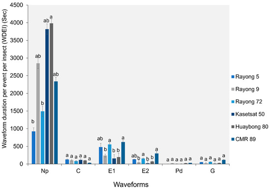 The waveform duration per event per insect (WDEI) for all waveforms on six cassava cultivars. Bars (mean ± SEM) with the same letter at the top within a waveform category are not significantly different at p = 0.05 (Tukey’s test): Np = non-probe; C = pathway phase; E1 = salivation phase; E2 = ingestion phase; Pd = potential drops; and G = xylem feeding.