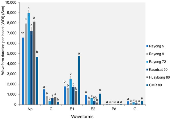 The WDI for all waveforms on six cassava cultivars. Bars (mean ± SEM) with the same letter at the top within a waveform category are not significantly different at p = 0.05 (Tukey’s): Np = non-probe; C = pathway phase; E1 = salivation phase; E2 = ingestion phase; Pd = potential drops; and G = xylem feeding.