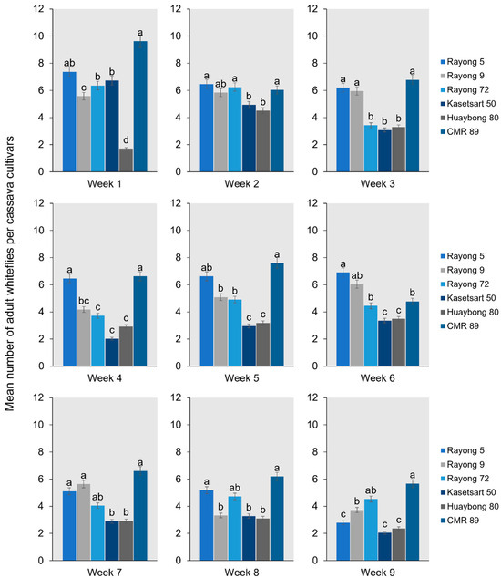 The mean number of adult whiteflies settled on the cassava cultivar was 1 to 9 weeks after release. Bars represent the mean percentage of whiteflies settled (mean ± SEM). Different letters above the bars indicate significant differences.