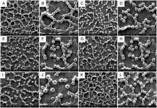 The morphology of the abaxial surface of the six cassava leaves (Rayong5, Rayong9, Rayong72, Kasetsart50, Huaybong80, and CMR-89) was analyzed for trichome density and size. Samples from the fourth leaf of 8-week-old plants were fixed in 37% formaldehyde overnight, washed in phosphate-buffered saline, and dehydrated in an ethanol series (70%, 80%, 95%, and 100%) [78,79]. Samples were critical-point dried and coated with gold-palladium [57,79]. The fixed surfaces of the leaves were then observed under a cutting-edge scanning electron microscope (SEM) (SEM™, FEI, Quanta450, Eindhoven, The Netherlands). Trichome density was counted manually per 100 and 50 µm2, with ten biological replications and five images per leaf. Trichome sizes were measured for each treatment with 15 replications per cultivar.