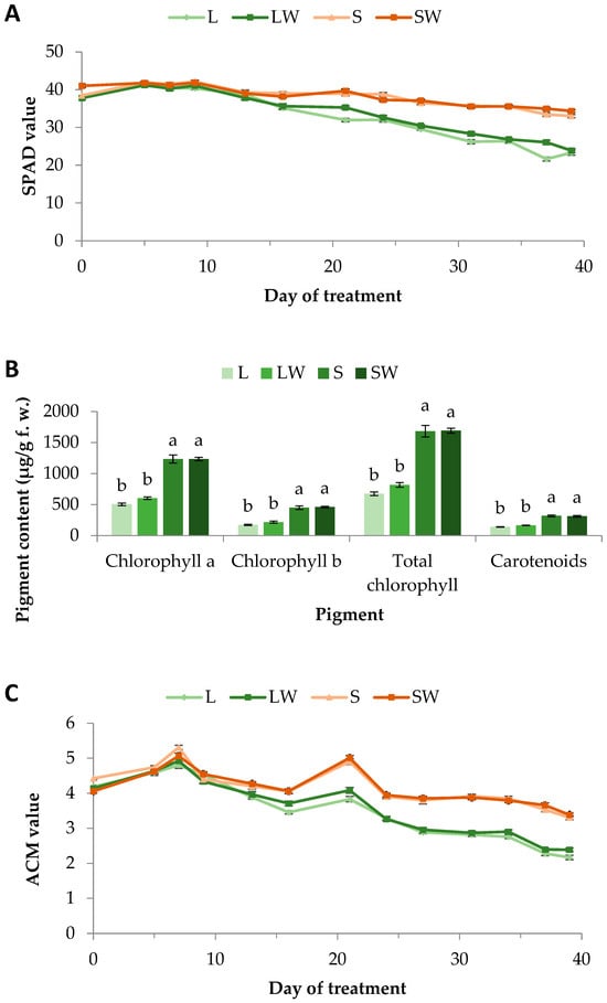 All 28 plants (seven plants per treatment) grew normally and without physiological disorders. According to a 39-day period of SPAD measurements, the leaf chlorophyll content profiles of basil plants were similar for all four treatments until about D16. Thereafter, a large decrease in the chlorophyll content appeared in plants cultivated under full sunlight and irrespective of wind treatments, which lasted until the end of the experiment. Specifically, on D39 the decrease was 39 and 37% for L (Light treatment) and LW (Light + Wind treatment) plants, respectively, compared to the corresponding values of D0. Under shade, the chlorophyll content followed a similar pattern but at a lower rate, that is a 14 and 17% decrease to S (Shade treatment) and SW (Shade + Wind treatment) plants, respectively (Figure 1A). Therefore, at the end of the experiment, shaded plants exhibited 41–43% higher SPAD values than the lightened ones. The above results demonstrate that while the chlorophyll content decreases during basil aging, shading prevents the chlorophyll decrease.