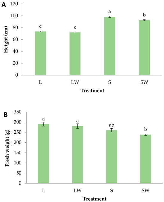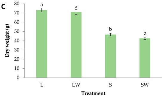 (A) Height, (B) fresh weight, and (C) dry weight of basil plants grown for 39 days under different light intensity and wind conditions. The treatments are L—Light, LW—Light and Wind, S—Shadow, SW—Shadow and Wind. Bars (±SE) followed by different letters are significantly different (p ≤ 0.05).