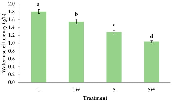 Water-Use Efficiency of basil plants grown for 39 days under different light intensity and wind conditions. The treatments are L—Light, LW—Light and Wind, S—Shadow, SW—Shadow and Wind. Bars (±SE) followed by different letters are significantly different (p ≤ 0.05).