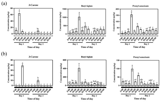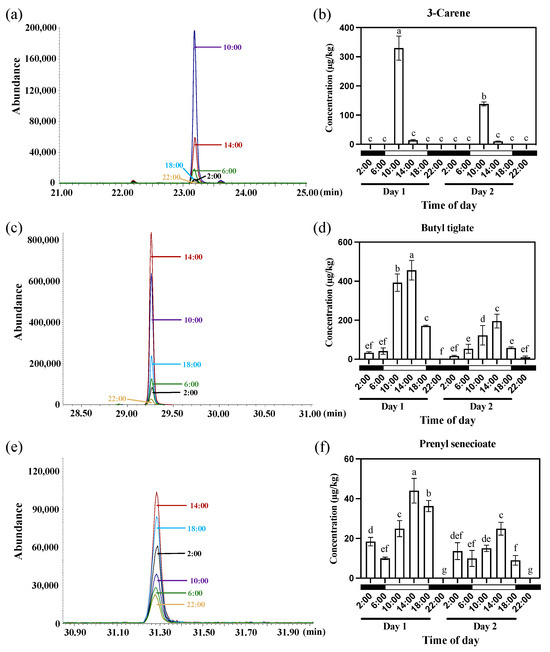 The emission patterns of three floral scent compounds—3-Carene, Butyl tiglate, and Prenyl senecioate—in Oncidium Twinkle ‘Red Fantasy’ under normal photoperiod (under 12 h light/12 h dark). (a) Overlapping analysis of 3-Carene ion current in samples at different time points within 24 h. The abscissa represents the retention time (min), and the ordinate represents the ion current intensity. (b) The emission patterns of 3-Carene from Oncidium Twinkle ‘Red Fantasy’ flowers within 48 h. (c) Overlapping analysis of Butyl tiglate ion current in samples at different time points within 24 h. The abscissa represents the retention time (min), and the ordinate represents the ion current intensity. (d) The emission patterns of Butyl tiglate from Oncidium Twinkle ‘Red Fantasy’ flowers within 48 h. (e) Overlapping analysis of Prenyl senecioate ion current in samples at different time points within 24 h. The abscissa represents the retention time (min), and the ordinate represents the ion current intensity. (f) The emission patterns of Prenyl senecioate from Oncidium Twinkle ‘Red Fantasy’ flowers within 48 h. Each treatment was conducted in triplicate with three technical repeats. Values are mean ± SD. Different lowercase letters indicate a statistically significant difference (p < 0.05).