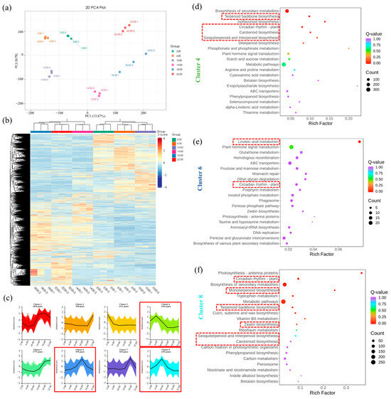 Transcriptomic analysis of Oncidium Twinkle ‘Red Fantasy’ at different time points within 24 h (under 12 h light/12 h dark). (a) Principal component analysis (PCA) plot showed overall differences among six groups (2:00, 6:00, 10:00, 14:00, 18:00, and 22:00) and the variability between intra-group samples. (b) Heatmap of differentially expressed genes (DEGs) sorted by K-means clustering across the samples collected at different time points. The numbers 1, 2, and 3 with each sample represented number of replicates. (c) Eight K-means clusters (Clusters 1–8) showed differential expression trends of DEGs at different time points. (d) KEGG enrichment analysis of DEGs in Cluster 4. The red boxes indicate metabolic pathways related to aroma rhythm release. (e) KEGG enrichment analysis of DEGs in Cluster 6. The red boxes indicate metabolic pathways related to aroma rhythm release. (f) KEGG enrichment analysis of DEGs in Cluster 8. The red boxes indicate metabolic pathways related to aroma rhythm release.