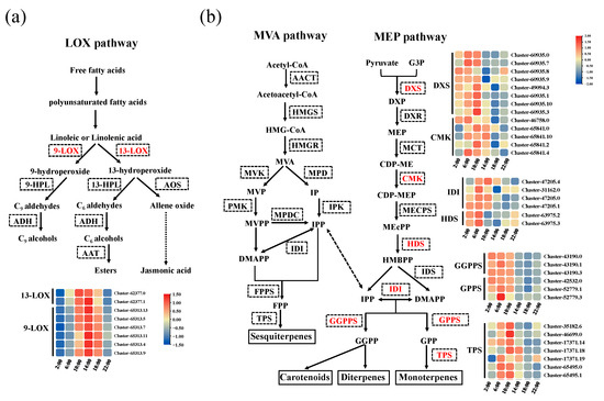 Overview of metabolites and DEGs in the biosynthesis pathways of fatty acid derivative and terpenoid in Oncidium Twinkle ‘Red Fantasy’. (a) The DEGs of Cluster 6 were enriched in the fatty acid derivative biosynthesis pathway. 9-lipoxygenase (9-LOX), 13-lipoxygenase (13-LOX), 9-hydroperoxide lyase (9-HPL), 13-hydroperoxide lyase (13-HPL), alcohol dehydrogenase (ADH), allene oxide synthase (AOS), and alcohol acyltransferase (AAT). The black dashed boxes represent genes enriched in the LOX pathway, and the red fonts represent differentially expressed genes. (b) The DEGs of Cluster 4 and Cluster 8 were enriched in the terpenoid biosynthesis pathway. Acetyl-CoA acetyltransferase (AACT), hydroxymethylglutaryl-CoA synthase (HMGS), hydroxymethylglutaryl-CoA reductase (HMGR), mevalonate kinase (MVK), mevalonate phosphate decarboxylase (MPD), phosphomevalonate kinase (PMK), isopentenyl phosphate kinase (IPK), mevalonate diphosphate decarboxylase (MPDC), isopentenyl diphosphate isomerase (IDI), farnesyl pyrophosphate synthase (FPPS), terpenoid synthase (TPS), 1-deoxy-D-xylulose 5-phosphate synthase (DXS), 1-deoxy-D-xylulose 5-phosphate reductoisomerase (DXR), 2-C-methyl-D-erythritol 4-phosphate cytidylyltransferase (MCT), 4-(cytidine 5′-diphospho)-2-C-methyl-D-erythritol kinase (CMK), 2-C-methyl-D-erythritol 2,4-cyclodiphosphate synthase (MECPS), 4-hydroxy-3-methylbut-2-en-1-yl diphosphate synthase (HDS), isoprenyl diphosphate synthase (IDS), geranylgeranyl pyrophosphate synthase (GGPPS), and geranyl diphosphate synthase (GPPS). The black dashed boxes represent genes enriched in the MVA and MEP pathway, and the red fonts represent differentially expressed genes.