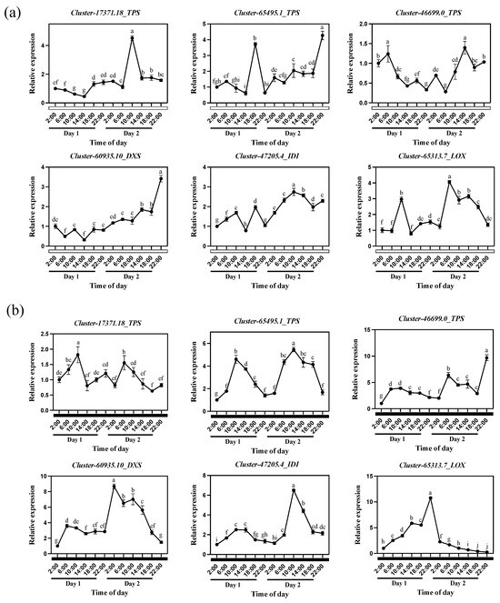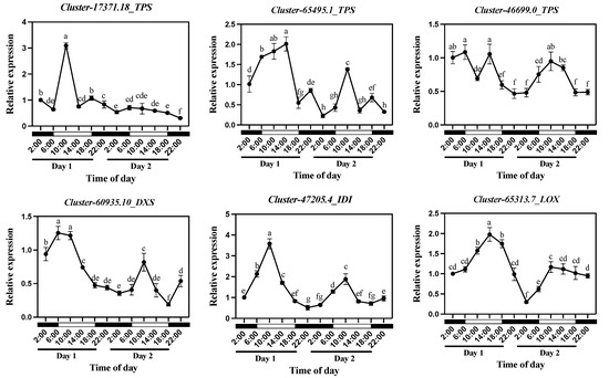 Relative expression of structural genes Cluster-17371.18_TPS, Cluster-65495.1_TPS, Cluster-46699.0_TPS, Cluster-60935.10_DXS, Cluster-47205.4_IDI, and Cluster-65313.7_LOX in Oncidium Twinkle ‘Red Fantasy’ flowers within 48 h (under 12 h light/12 h dark). Each treatment was conducted in triplicate with three technical repeats. Values are mean ± SD. Different lowercase letters indicate a statistically significant difference (p < 0.05).