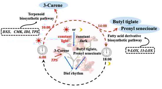 The synthesis of floral compounds in plants is a dynamic process throughout the entire plant cycle and is regulated by many factors, including light [13], flowering stages [14], diurnal patterns [15], and visiting insects [16]. The release of flower compounds usually exhibits a distinct diel rhythm, which has been demonstrated in many plants. These include snapdragon [17], rose [18], and Wisteria [19] flowers that release scent in the daytime, as well as Petunia axillaris [20] and Nymphaea subg. Hydrocallis [21] that release scent in the night. The release of the main active aroma compounds Myrcene and (E)-β-ocimene in snapdragon exhibited a diel rhythm variation with an increase during the day and a decrease at night [17]. The emission of the four major volatiles (E)-β-ocimene, benzaldehyde, geranyl isovalerate, and benzyl tiglate in Globe amaranth showed a diel rhythmic pattern, with the maximum emission occurring in the late afternoon and the lowest emission occurring at night [22]. The main floral components of Petunia axillaris were methyl benzoate, benzaldehyde, and isoeugenol, which exhibited a circadian rhythm [20]. The highest release occurred at 0 a.m. and lowest at 12 p.m. [20]. The release of floral compounds is regulated by genes, and the expression of many genes in the MEP pathway of terpenoid synthesis is rhythmic [17]. The monoterpene synthetase and deoxyoxyketose-5-phosphate synthetase (DXPS) genes of snapdragon showed a consistent change pattern of terpenoids, and this circadian rhythm was regulated by the endogenous circadian clock [17]. The expression levels of DXS, DXR2, MCT, and HDR genes in Populus trichocarpa followed a consistent rhythm with the release of monoterpenes [23]. The expression of terpene synthase gene OfTPS5 in osmanthus flower showed a rhythm of increasing in the day and decreasing at night [24]. Many esters’ metabolism was also regulated by the circadian clock. In Rosa hybrida, the release of geranyl acetate exhibited a consistent diel rhythm with the gene expression of the RhAAT in the LOX pathway [18]. In addition, the accumulation of ZmLOX10 in the maize LOX pathway was strictly regulated by the diel rhythm, and was consistent with the highest photosynthetic activity over time [25]. At present, the research on the molecular mechanism of diel rhythm mainly focuses on Arabidopsis [26,27]. In petunias, the circadian rhythm-related gene PhLHY regulates the volatilization of aroma compounds by inhibiting the expression of genes on the floral volatile benzenoid/phenylpropanoid pathway during the day [28]. Yon et al. [29] silenced two key circadian rhythm-related genes, NaLHY and NaZTL, resulting in changes in the endogenous rhythm of volatile compound release. Many studies have found that genes involved in the synthesis and metabolism of different volatile compounds exhibit rhythmic expression. However, the specific metabolic mechanisms by which the diel rhythm affects floral scent are still unclear.