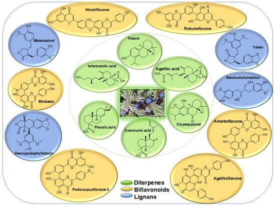 The common Juniper plant is known to possess an extensive array of biologically active compounds, including: terpenes (volatile monoterpenes and non-volatile diterpenic derivatives), lignans, flavonoids, organic acids (glycolic, malic, and ascorbic), proteins, fermentable sugars, wax, and other compounds (Figure 1) [,,]. The volatile compounds that make up the Juniper essential oil have received extensive attention [,,,]. They include monoterpene hydrocarbons (α-pinene, β-pinene, myrcene, sabinene, limonene), oxygenated monoterpene derivatives (terpinen-4-ol, borneol,), and sesquiterpenes (germacrene, β-caryophyllene) []. The content and composition of volatiles in Juniper cone berries varies widely from below 0.5% to over 3.5% []. In contrast, the current review focuses on the non-volatile secondary metabolites. This article aims to complement and update other excellent reviews on the topic of Juniper. Seca and Silva [] made a comprehensive inventory of compounds published between 1970 and 2004 from various Juniperus species, continued by a later second review []. Gonçalves et al. [] described the bioactivity of Juniper extracts, volatile organic compounds, phenolic acids, coumarins, anthocyanins, flavan-3-ols, proanthocyanidins, flavonols, flavones, carotenoids, and chlorophylls. Tavares and Seca [] focused on a selection of diterpenes, flavonoids and one lignan. Other reviews [,] classified data according to the type of biologic activity exerted by various natural products from Juniperus communis.