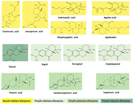 In Cupresaceae species, particularly in genus Juniperus, communic acids are a diterpenic natural product group with a labdane skeleton that contains three double bonds and a carboxyl group at C19 [,]. The most representative communic acids in common Juniper are trans-communic acid and cis-communic acid [].