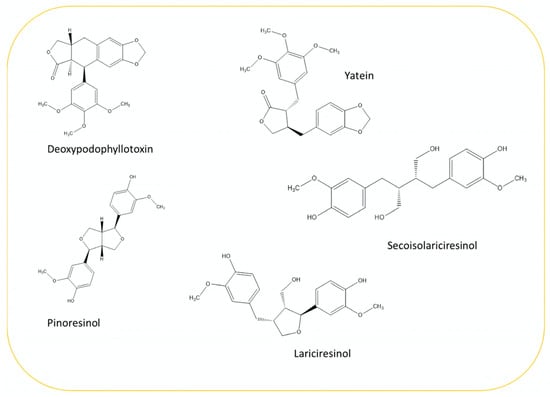 In Juniperus communis, the aryltetralin derivative deoxypodophyllotoxin is the main lignan []. Its content in leaves varies between 78 mg/100 g dry weight in ‘Horstman’ and 37.1 mg/100 g dry weight in ‘Gold cave’ varieties. Conversely, podophyllotoxin contents only span between 12.5 (‘Horstman’) and 2.2 mg/100 g dry weight (‘Depressa Aurea’). These compounds are of particular interest in antineoplastic therapies. The anticancer effects and mechanisms by which deoxypodophyllotoxin exerts them have recently been reviewed and based on research of numerous cell lines, including prostate cancer, cervical carcinoma, breast cancer, colorectal cancer, glioblastoma, oesophageal carcinoma []. Both mitochondrial and non-mitochondrial pathways are involved in the pro-apoptotic activity. Pharmacokinetic investigations performed in tumour-bearing mice showed that the compound had higher affinity for the cancer tissues than for plasma, and achieving particularly high concentrations in reproductive organs, fat and lungs []. Deoxypodophyllotoxin has as well other properties of medicinal interest including antibacterial, anti-inflammatory and antifertility [,,,,,,,,,,,,,,,,,,,,,,,,,,,,,,,,,,,,,,,,,,,,,,,,,,,,,,,,,,,,] (Table 1).