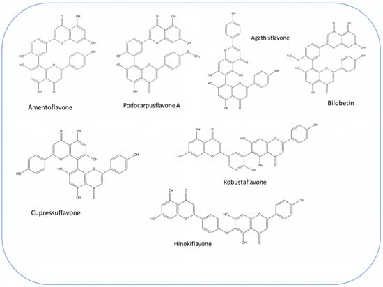Biflavonoids are composed of two monoflavonoid residues or flavonoids dimers. As summarized by He and co-workers, they occur naturally in angiosperms, bryophytes, and gymnosperms. Based on the presence or absence of an atom in the linker between the two residues, they can be classified into three groups (e.g., C-C linkages, C-linear fragments-C type, complex biflavonoids) (Figure 4) []. These compounds are present in many Juniper species, including common Juniper and contribute to some valuable bioactivities of these plants. Amentoflavone, hinokiflavone, cupressuflavone, and methyl-biflavones were isolated from J. communis cone berries in amounts ranging from 0.14 to 1.38 mg/g of fresh weight [].