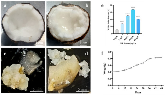 Induction of coconut endosperm callus. (a) Reference culture solid coconut endosperm. (b) Makapuno solid endosperm. (c) Callus induced from reference culture endosperm. (d) Callus induced from Makapuno endosperm. (e) Effect of 2-IP concentration on callus induction. (f) Proliferation of subcultured callus. **** indicates a statistically significant difference (p < 0.0001).