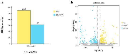 RNA was extracted from both reference culture (RC) and makapuno (MK) callus samples, followed by assessments of RNA concentration and purity. Only samples meeting quality standards were utilized for library construction and subsequent RNA-seq analysis. The RNA-seq results revealed a total of 429 significantly differentially expressed genes (DEGs) between RC and MK callus tissues (Figure 2). Among these, 273 DEGs were upregulated, and 156 were downregulated in the MK callus compared to the RC, indicating a predominance of upregulated genes.
